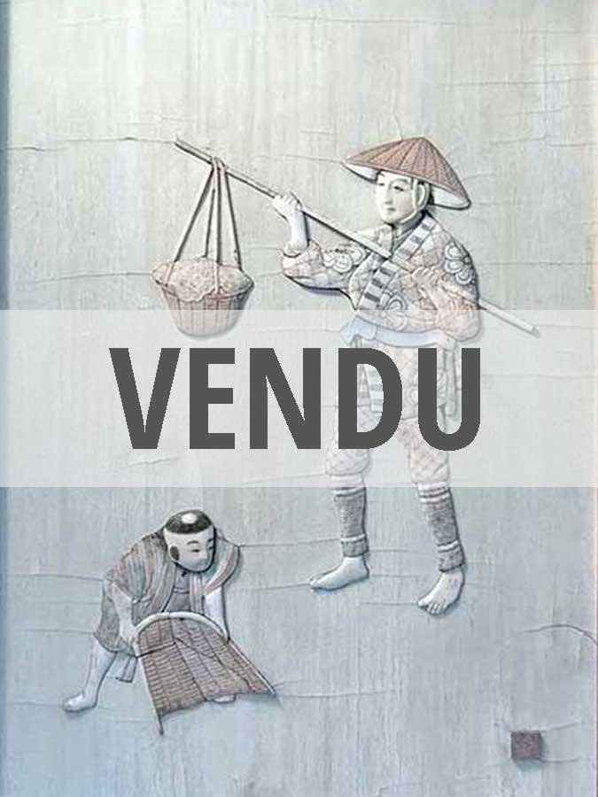 Peinture Japonaise sur panneau incrusté d’Os et de Nacre représentant un Pécheur et son Fils